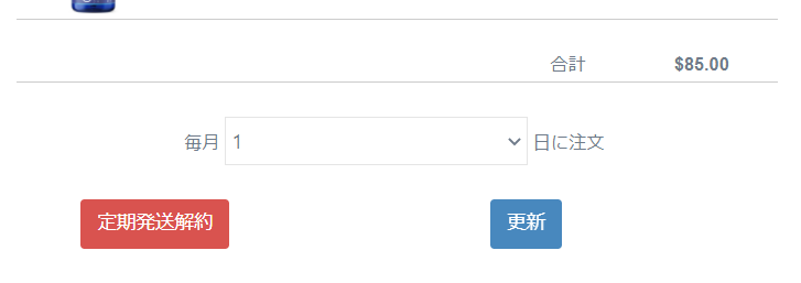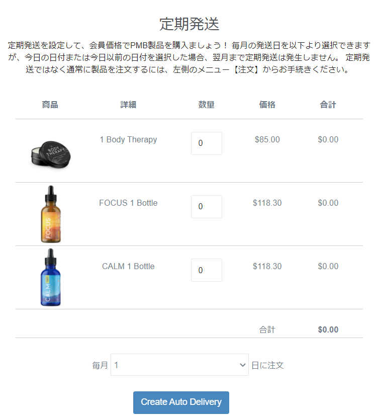 その中から「BODY THERAPY」の数量を入力、画面下部に「毎月〇日に注文」と選択できるので、注文したい日を入力しましょう。