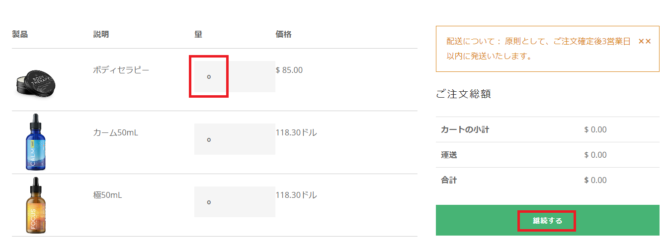 その中からBODY THERAPYを見つけ、数量を購入したい数で入力します。
