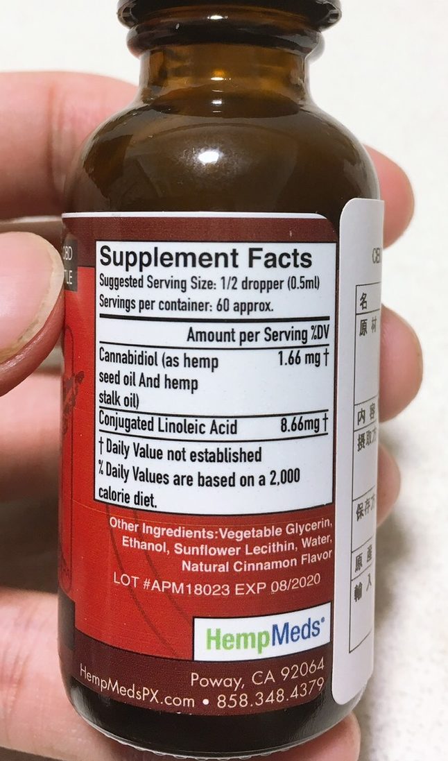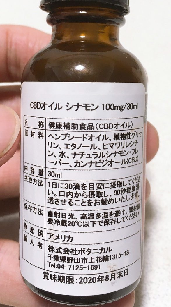 原材料:ヘンプシードオイル、植物性グリセリン、エタノール、ヒマワリレシチン、水、ナチュラルシナモン・フレーバー、カンナビジオール(CBD)