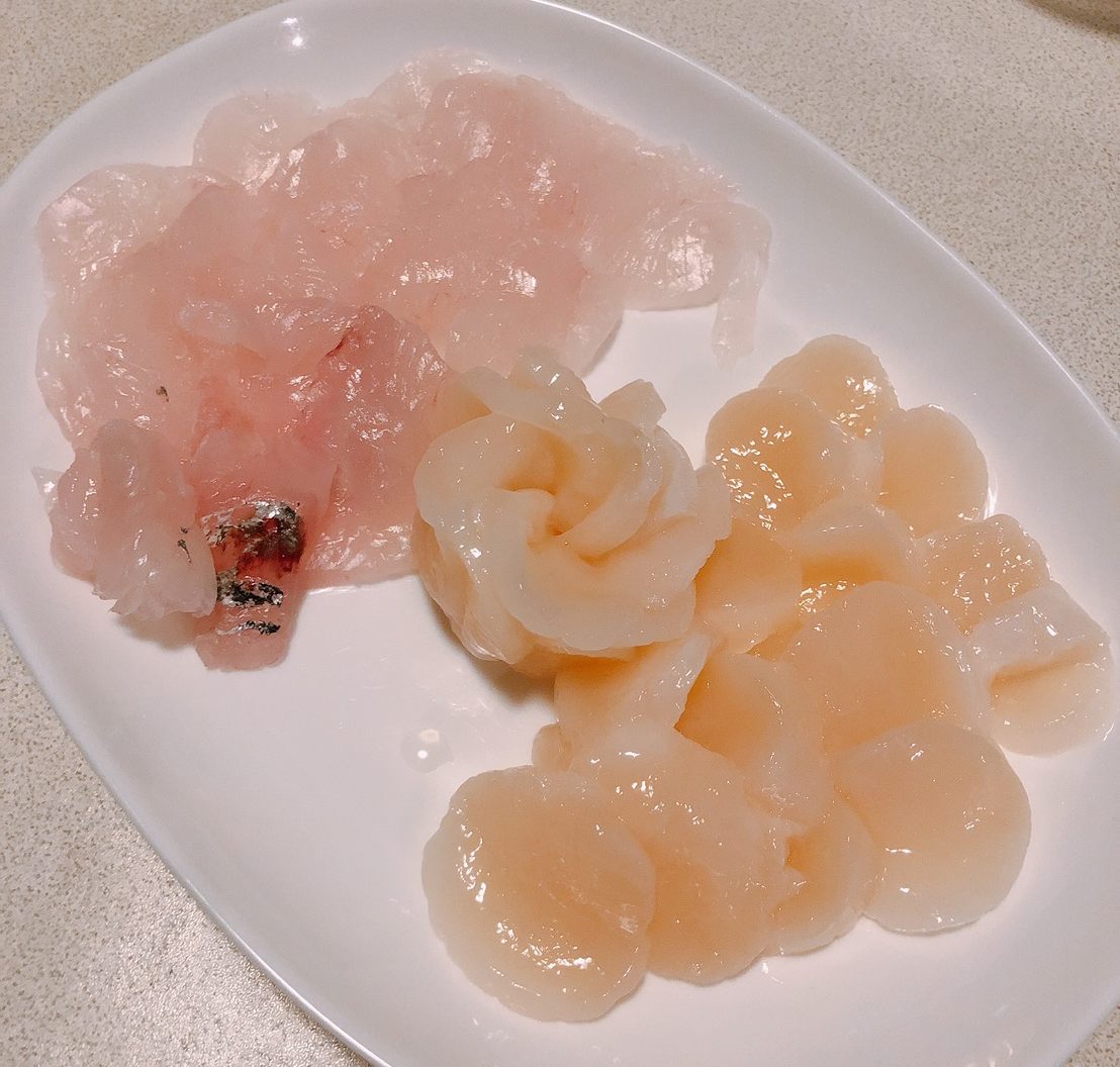 「上がマトウダイの刺身」「下がツキヒガイの貝柱刺身」