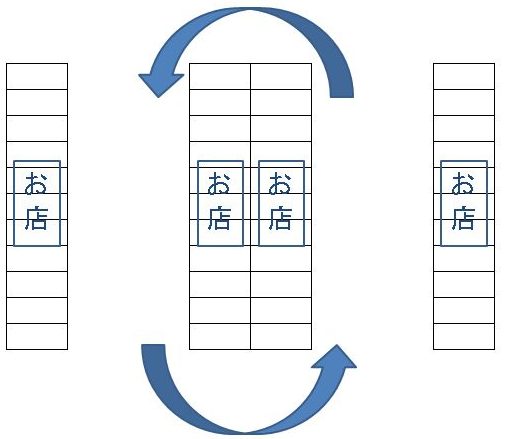 このような形でお店が並んでいるのでグルグル回りながら見て一回りする周り方になります。