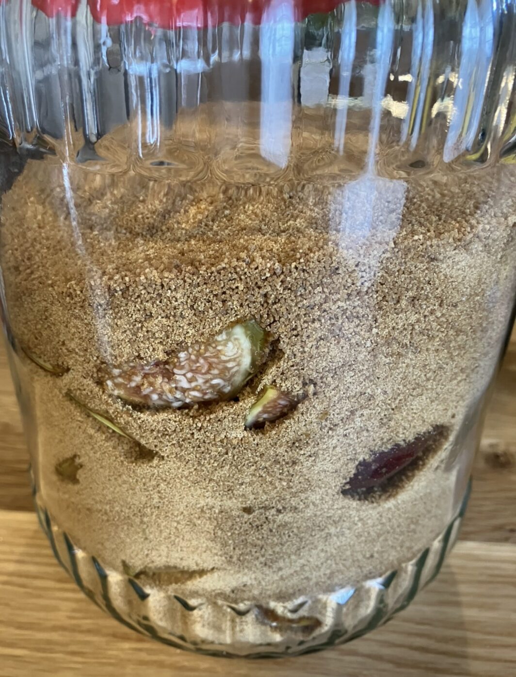 煮沸消毒した発酵瓶に「砂糖」「イチジク」「砂糖」「イチジク」の順番で入れます。入れる量は大体でOK。