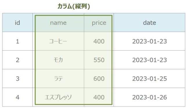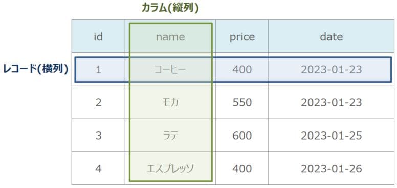 「カラム」は表の縦列を指し、「レコード」は表の横列を指します。