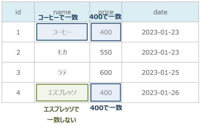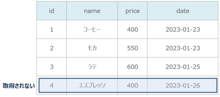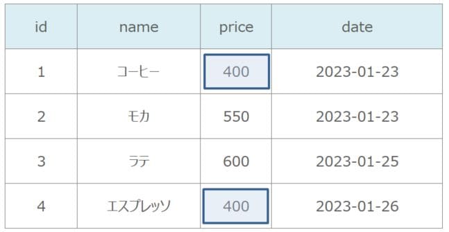 この場合、priceが400以上のデータ、つまり「モカ」と「ラテ」のデータを取得することになります。