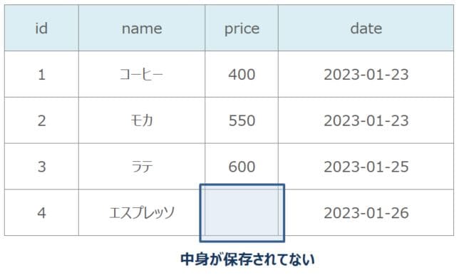 データベースで中身が無い(データが保存されていない)場合は、「NULL」と示します。
