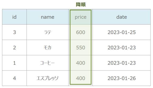 「DESC」の場合は降順なので数字が大きいものが先に並び替えされます。